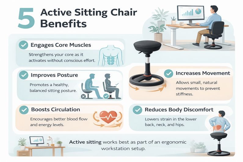 A major review in Applied Ergonomics found that active sitting does not always increase core muscle strength, but it can help reduce the negative effects of staying still for too long. Movement itself—not muscle training—is the main benefit.